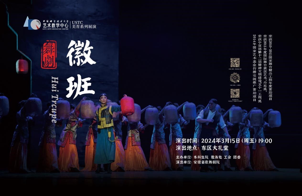 为丰富学校美育文化活动,协助构建德智体美劳全面发展的人才培养体系,由本科生院、教务处、工会和团委主办的“USTC美育系列展演”之舞剧《徽班》将于3月15日晚在校内举行。
